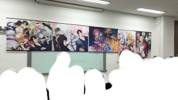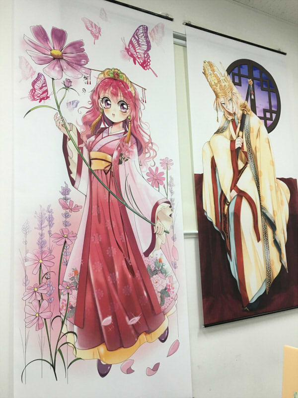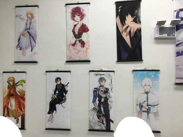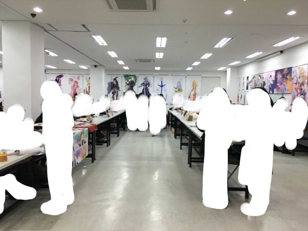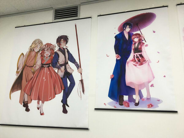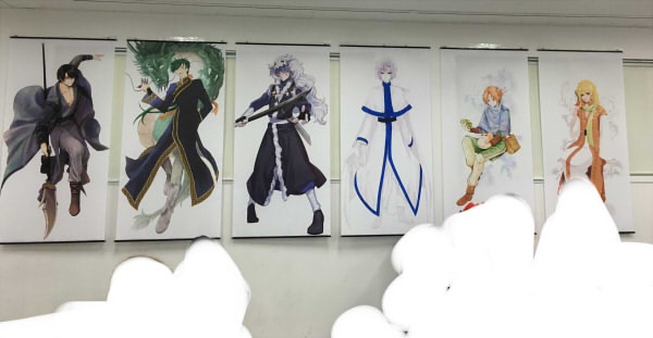 入ったらすぐ会場の壁にキャラクターのタペストリーがずらーっと並んでるんです!